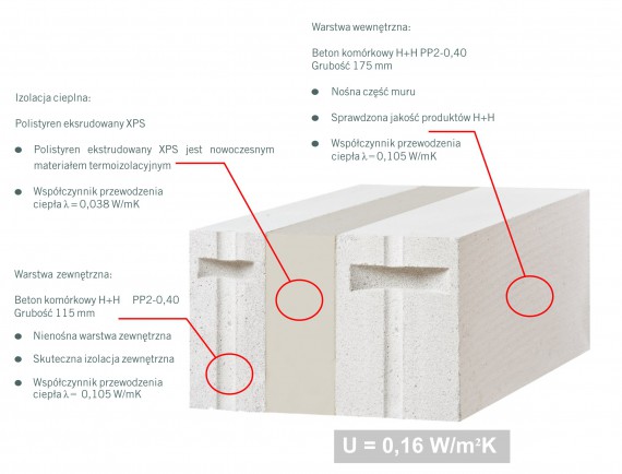 H+H Thermostein to jedyny na polskim rynku bloczek ze zintegrowaną warstwą izolacji cieplnej, umożliwiający wznoszenie ścian zewnętrznych o współczynniku U=0,16 W/m2K. Stosowanie bloczków nie wymaga wykonywania dodatkowej warstwy izolacji cieplnej, a ściana wykonana z tego materiału spełnia wszystkie wymagania dotyczące wytrzymałości, ognioodporności oraz izolacyjności cieplnej stawiane przegrodom budowlanym.